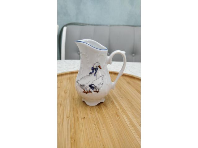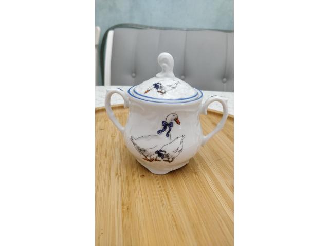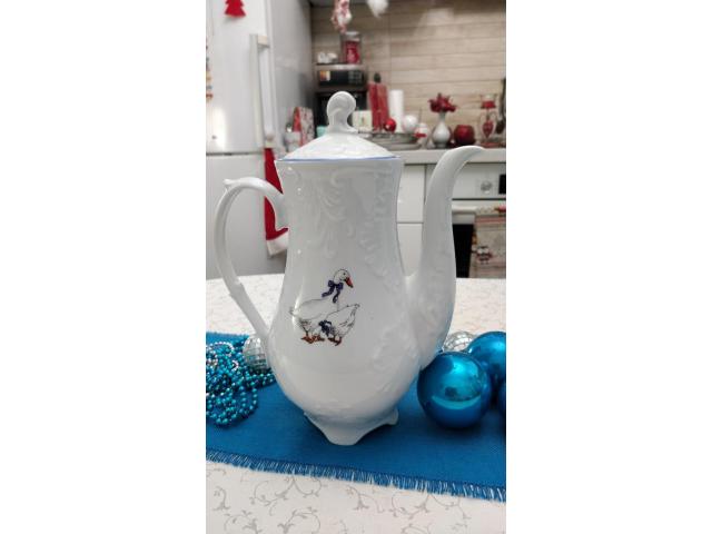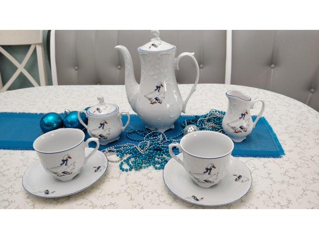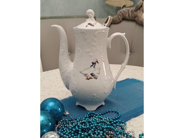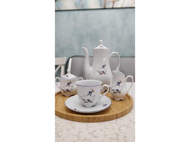 Предлагается покупателю фарфоровый заварочный чайник, серия «Rococo, гусь» объёмом 1,1 л. Также из данной серии имеются в наличии чайные пары в количестве 5 пар (5 блюдец и 5 чашек), сахарница объёмом 400 мл и сливочник объёмом 300 мл. Чайная пара: объём чашки составляет 300 мл, диаметр блюдца 16 см.