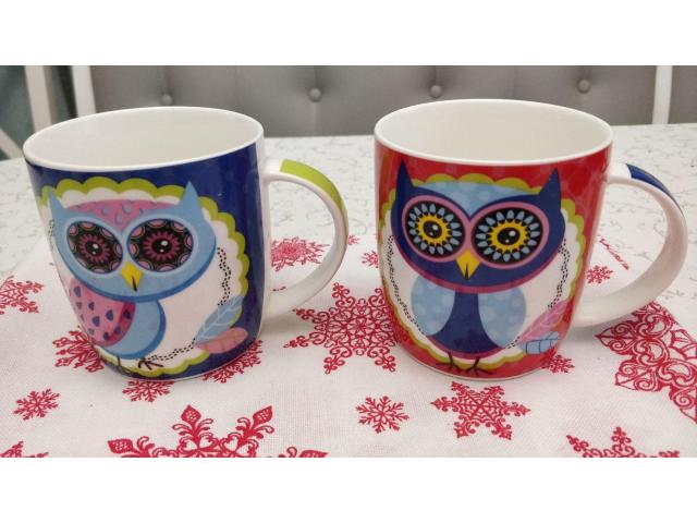 - фарфоровые кружки с изображением совы с двух сторон объёмом 400 мл каждая и общей стоимостью 15 рублей за 2 изделия, либо по 8 рублей за одну кружку (фотографии №2,3);