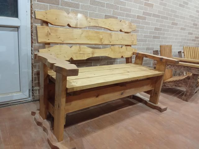 Скамейка из дерева, материал: сосна и ель, обработана декоративно-защитной пропиткой: "грецкий орех" и бесцветным лаком. Размеры: длина - 150 см, высота по спинке - 103 см, ширина - 68 см. Находится в г.п. Плещеницы Логойского района.