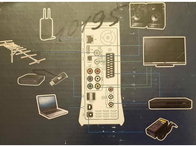 - интерфейс (видеовход Euro SCART, композитный вход; видеовыход HDMI 1.3, компонентный выход Y Pb Pr, композитный выход RCA; аудиовход Евро SCART (стерео), композитный вход (левый/правый/стерео), аудиовыход оптический (цифровой), стерео (аналоговый); USB (2 × USB 2.0 Host для подключения устройств, 1 × USB 2.0 для подключения к ПК); LAN (сеть) Ethernet (100Base-Tx/10Base-T), Wireless LAN (802.11 b/g/n) с помощью USB-адаптера (опционально )**; LCD-экран 2'' TFT LCD 262 тыс. цветов (18 бит), HDD (жёсткий диск) 3,5'' SATA1/2 (протестировано до 2 ТБ), NTFS, FAT32**; совместимость Microsoft Windows 98SE, ME, 2000, XP, Vista).