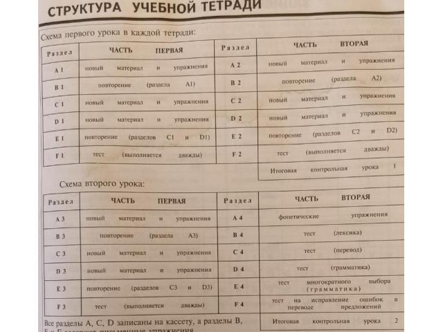 Пояснения к структуре рабочей тетради (фотография №9): все разделы A, C, D записаны на кассету, а разделы B, E и F содержат письменные упражнения. Тесты F1, F2 и F3 ученик выполняет дважды. Когда он пишет их первый раз, то он может заглядывать в материалы уроков, чтобы проверить, например, правописание слов и т.п. Во второй раз (на следующий день) следует выполнить эти упражнения самостоятельно. В руководстве мы даём решения тестов F и пояснения.