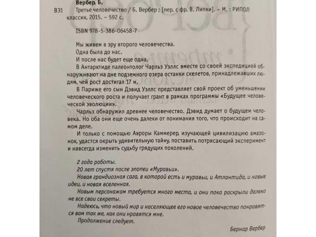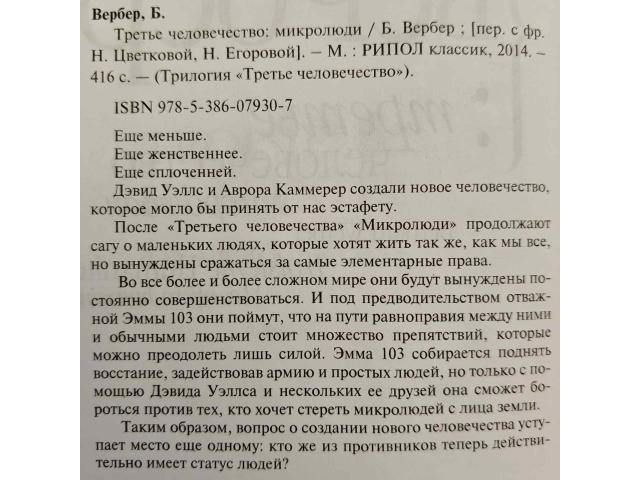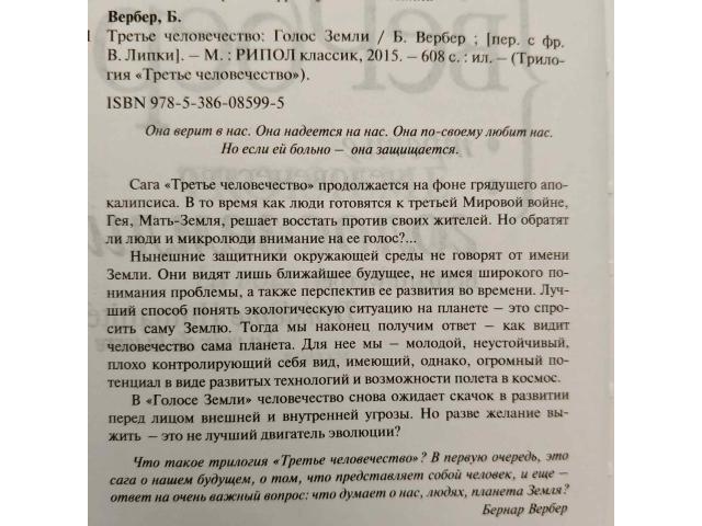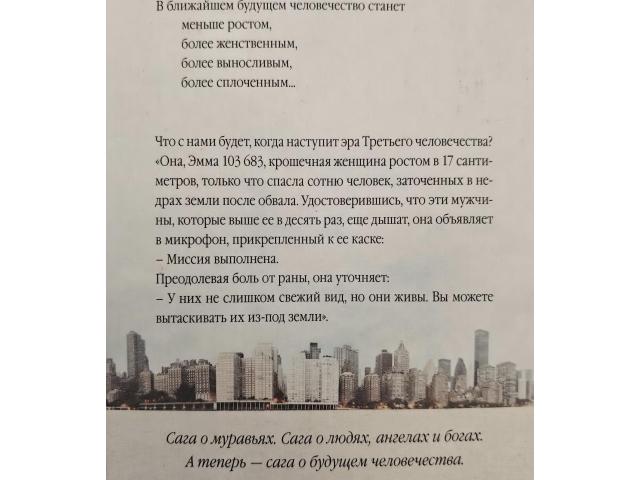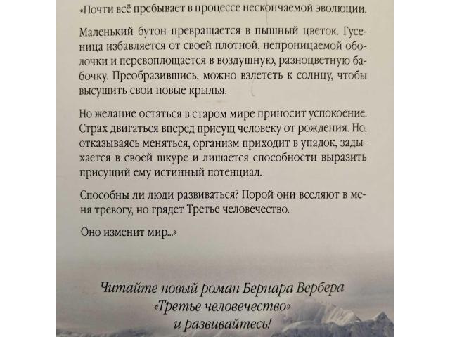 В продаже оригинальный, увлекательный, захватывающий и познавательный роман-трилогия Бернара Вербера "Третье человечество", - автора таких трилогий как "Муравьи", "Авантюристы науки", дилогии "Танатонавты" и др. Жанр произведения: смесь фантастики, мистики и философской притчи, свойственная Верберу, с его любовью к научным загадкам и социальным вопросам. Данная книга затрагивает темы защиты Земли, поиска нового пути для человечества, разумности планеты и межличностных отношений.