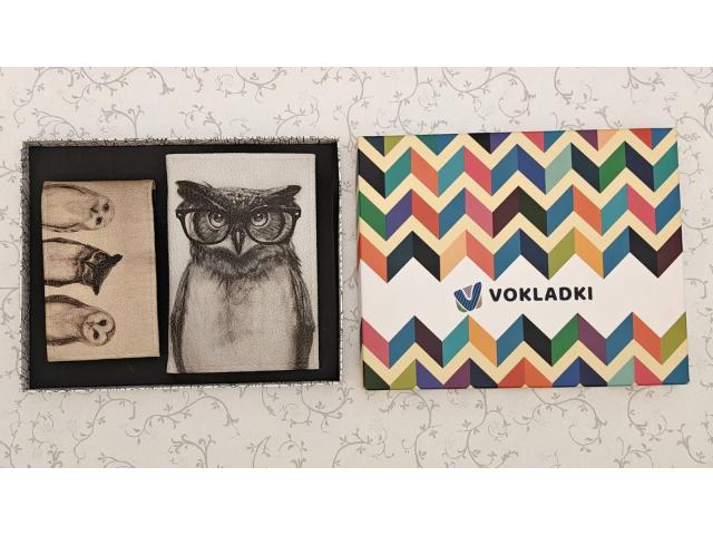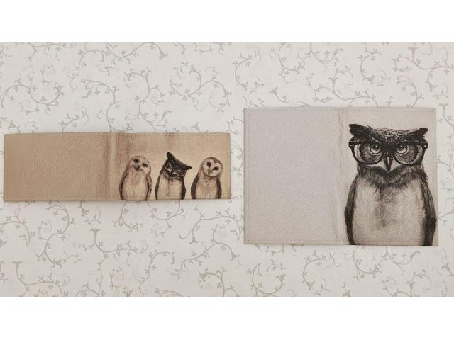 Продаётся новый набор, включающий в себя карманную визитницу (кляссер) и обложку для документов с изображениями символа в виде совы, олицетворяющей мудрость, знания, эрудицию и проницательность. Оба изделия изготовлены из натуральной кожи.