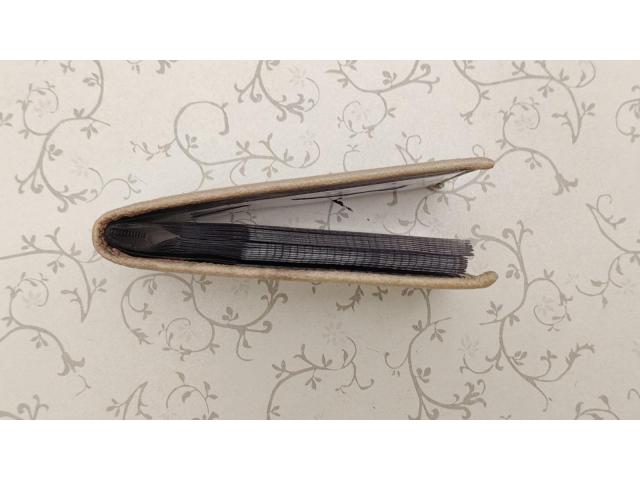 Карманная визитница (кляссер) для хранения визитных, банковских, скидочных (дисконтных) и подарочных карт представляет собой небольшую книжку-альбом с прозрачными кармашками и предназначена для ношения с собой. Изделие имеет 18 вкладышей, - максимальное количество вложения карт составляет 38 штук (36 карт в 18 двухсторонних вкладышах и 2 карты непосредственно во внутренних частях обложки). Размеры: длина 11 см, ширина 6,8 см, толщина 1,8 см.