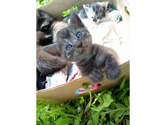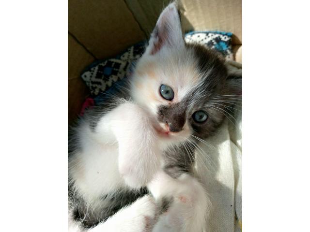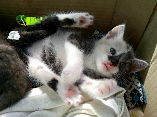Трёхцветка-девочка.Кодовая кличка Белоснежка. Самая шустрая и сообразительная. Первая научилась кушать, ходить. Заводила всей компании.